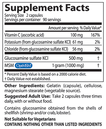 - Glucosamine Sulfate supports normal, healthy joint function and helps maintain healthy cartilage in joints.* MSM supports organ and joint function by donating sulfur for maintenance of healthy connective tissue.* Vitamin C is essential for production of collagen, a protein that gives strength to cartilage.*